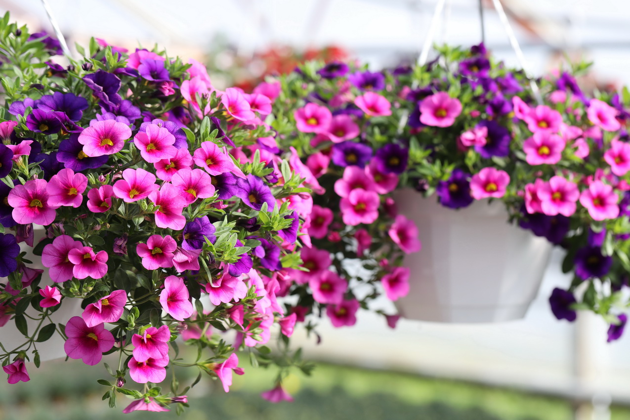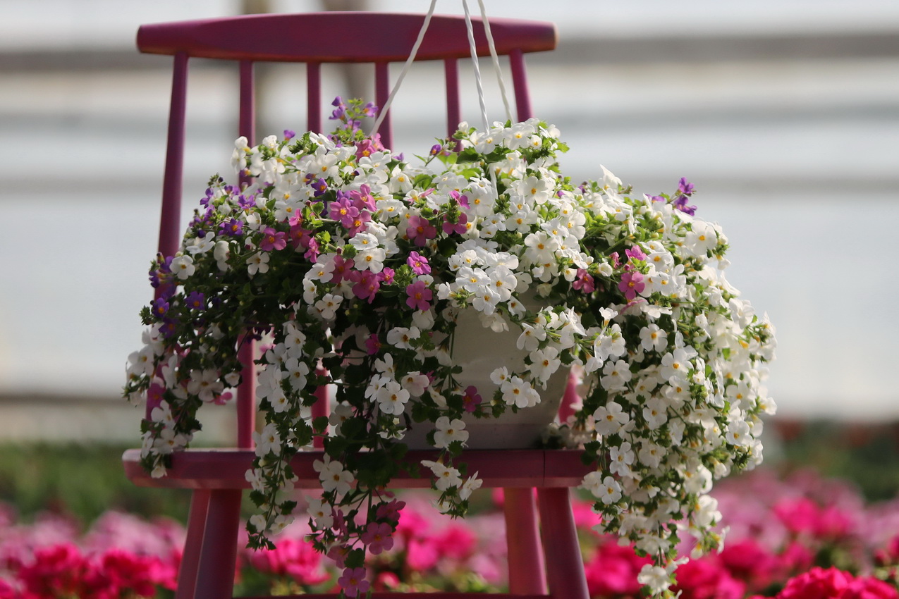 Rentovartiset kesäkukat pääsevät oikeuksiinsa amppeleissa.