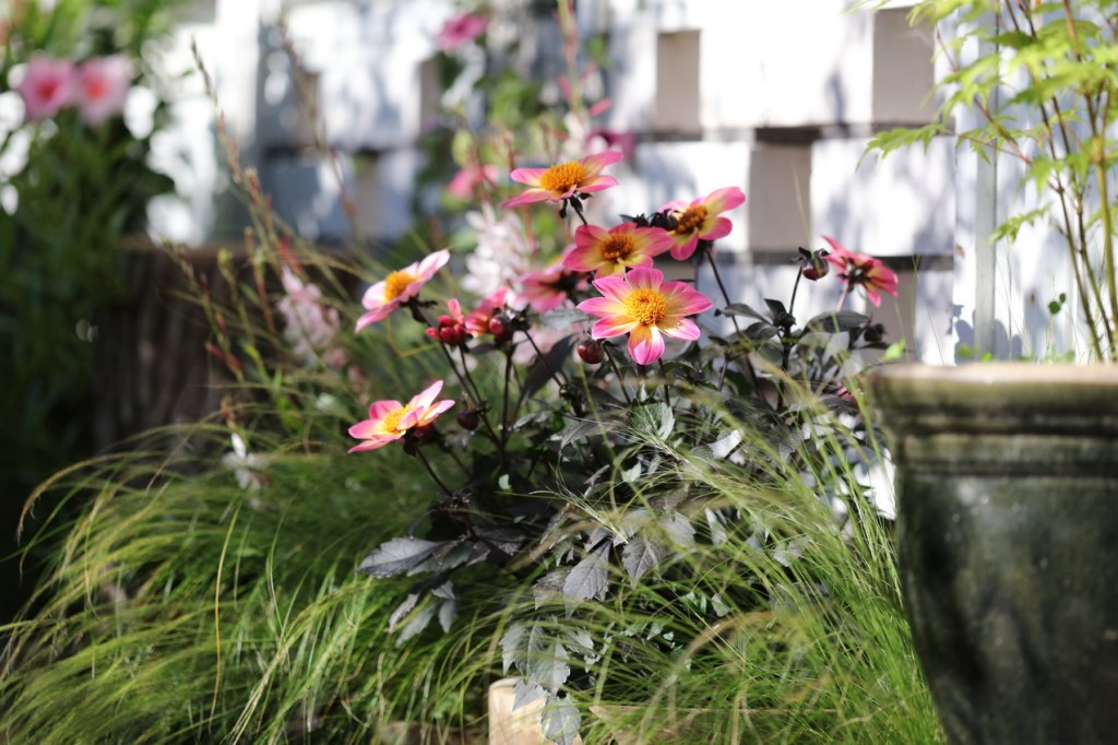 Jos taas tavoittelet kevyempää ilmettä, voit valita yksinkertaiskukkaisen daalian. Kaunista kontrastia saa aikaan yhdistämällä daalian seuraan kevyitä kasveja, tässä poninhäntä-heinää.