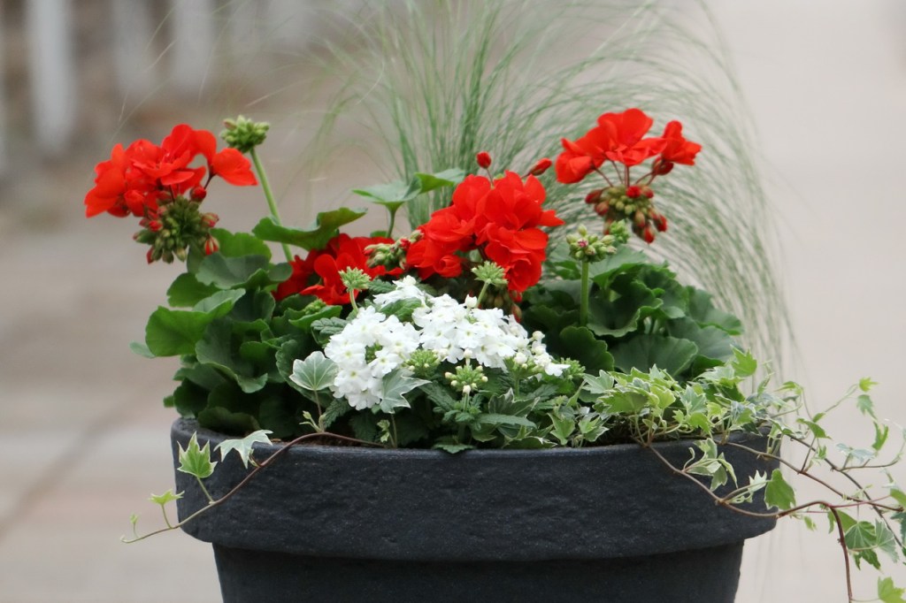 Tähän ruukkuun yhdistimme poninhännän kanssa punaisia pelargoneja, valkoisen rautayrtin sekä kirjavalehtisen muratin.