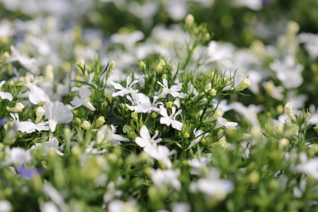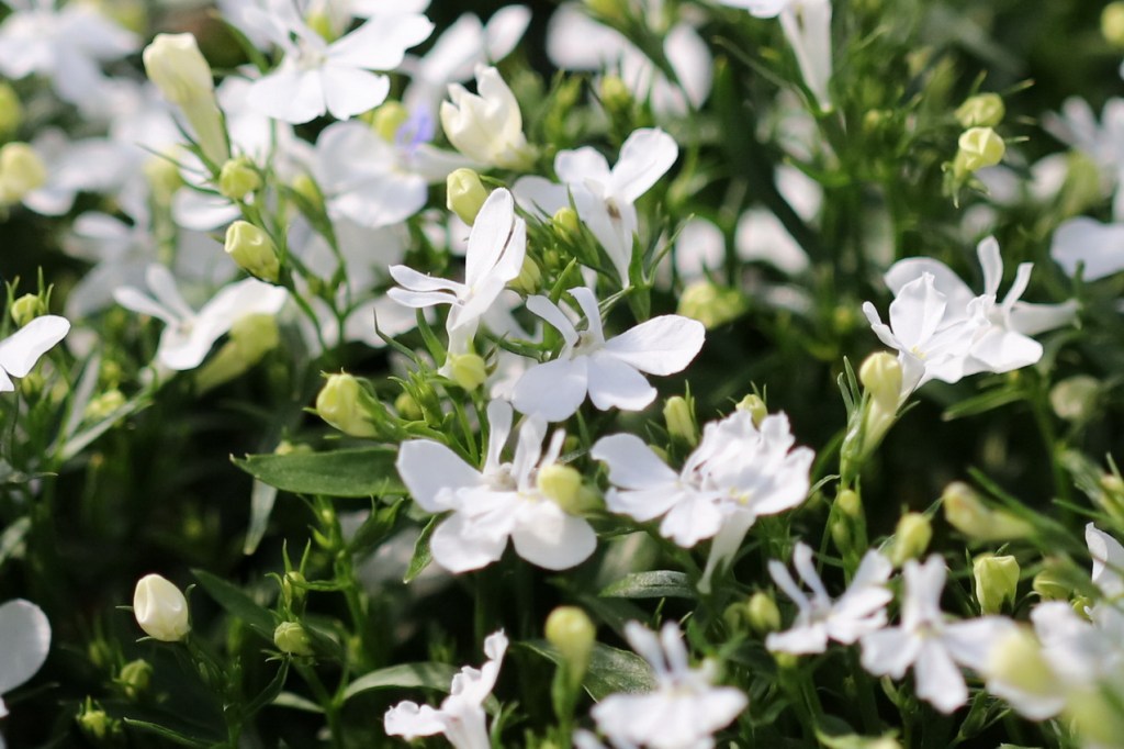 Lobelia on perinteinen kesäkukka, joka kasvaa tiheänä kasvustona ja kukkii pienin siroin kukin.