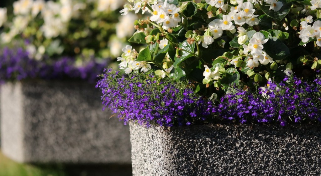 Tässä istutuksessa lobelian pienempi kasvumuoto antaa kaunista vastakohtaa begonialle.