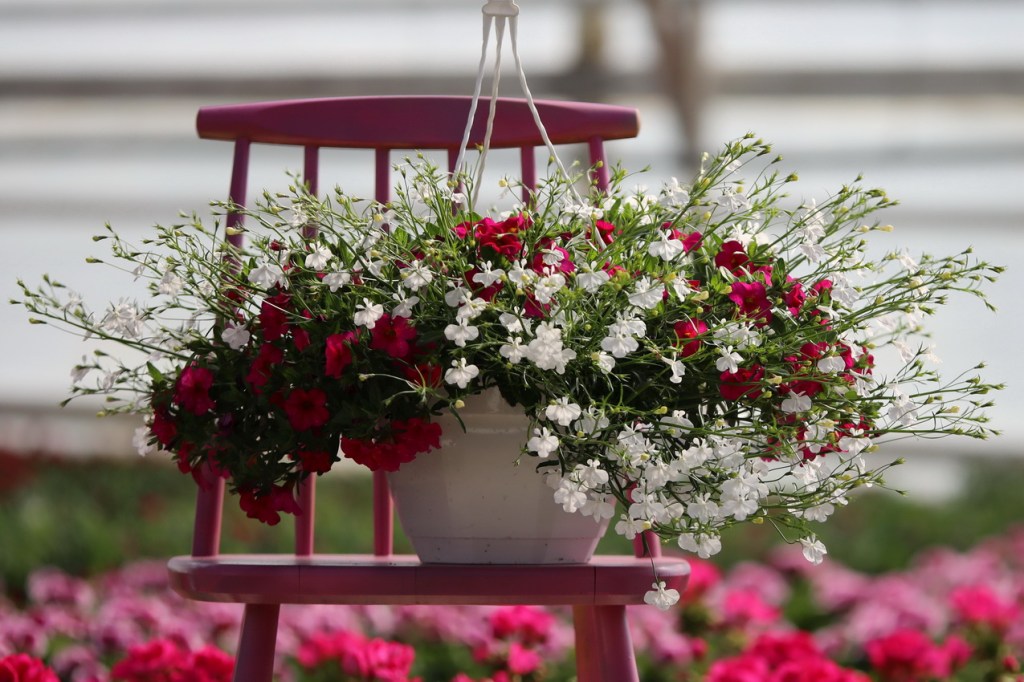Tähän amppeliin istutimme isokasvuisen valkoisen lobelian ja punaista miljoonakelloa.